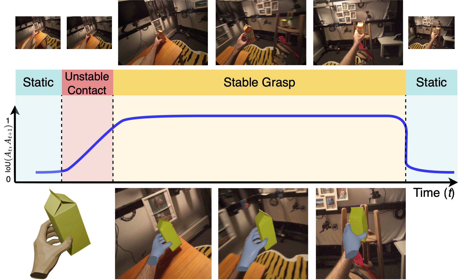 A constrained optimisation framework that reconstructs object poses in egocentric video by modelling temporal constraints, from static to stably grasped.